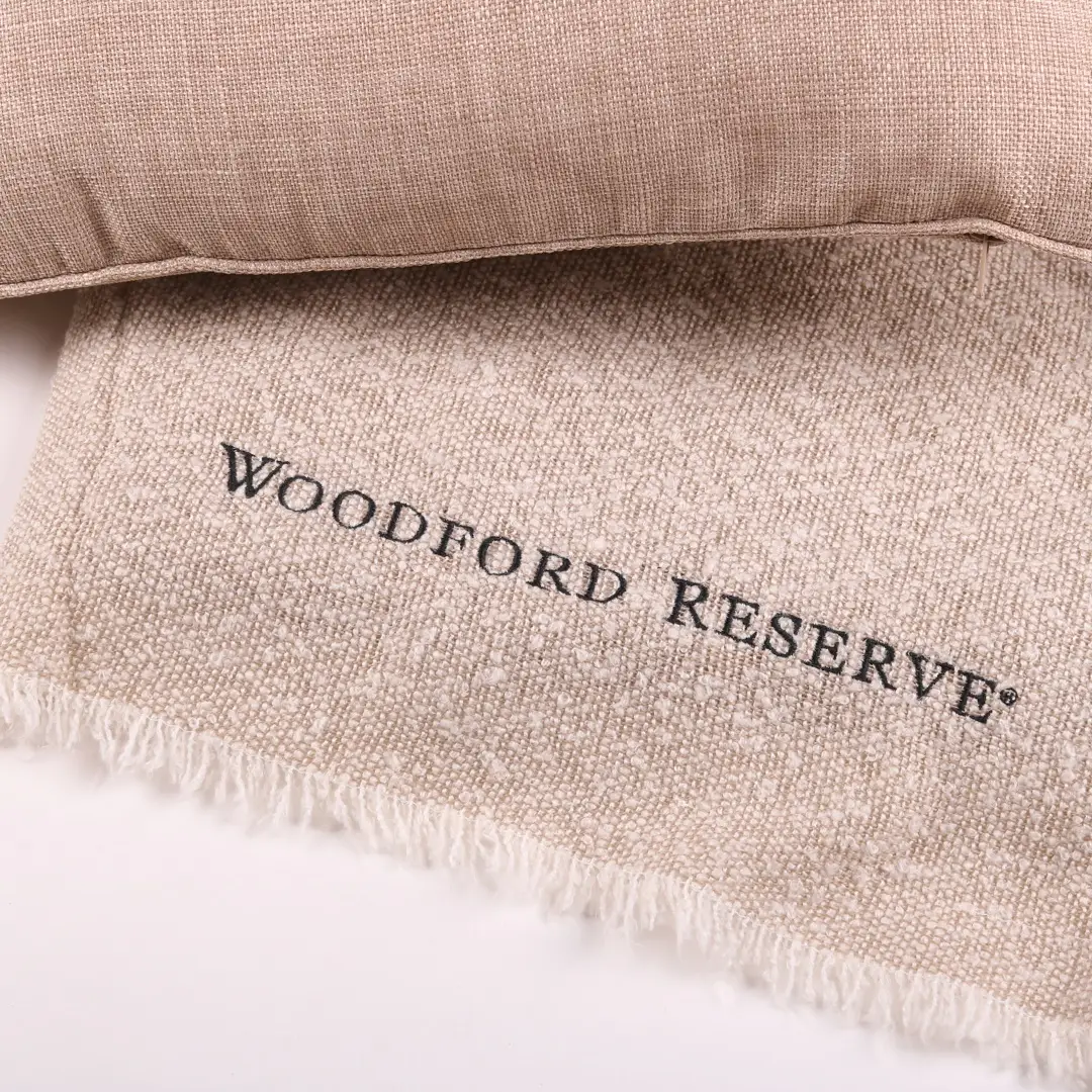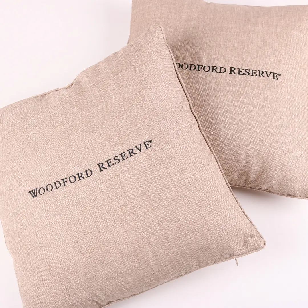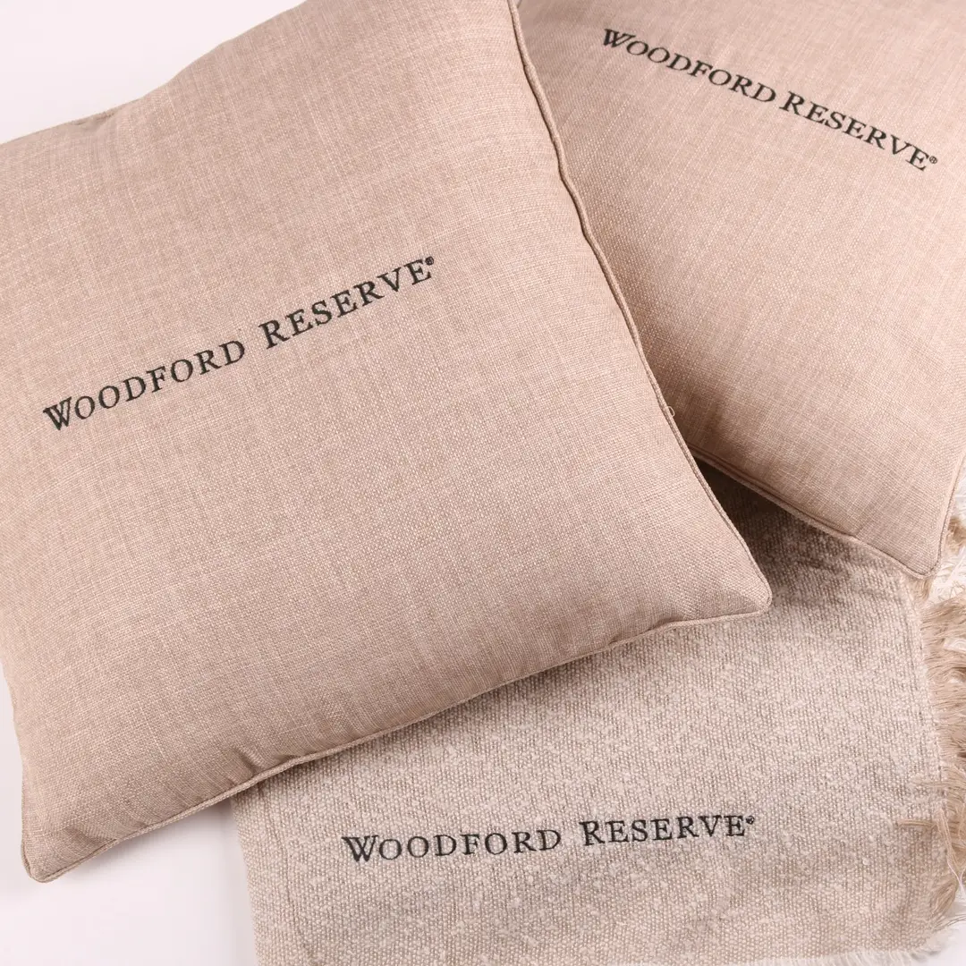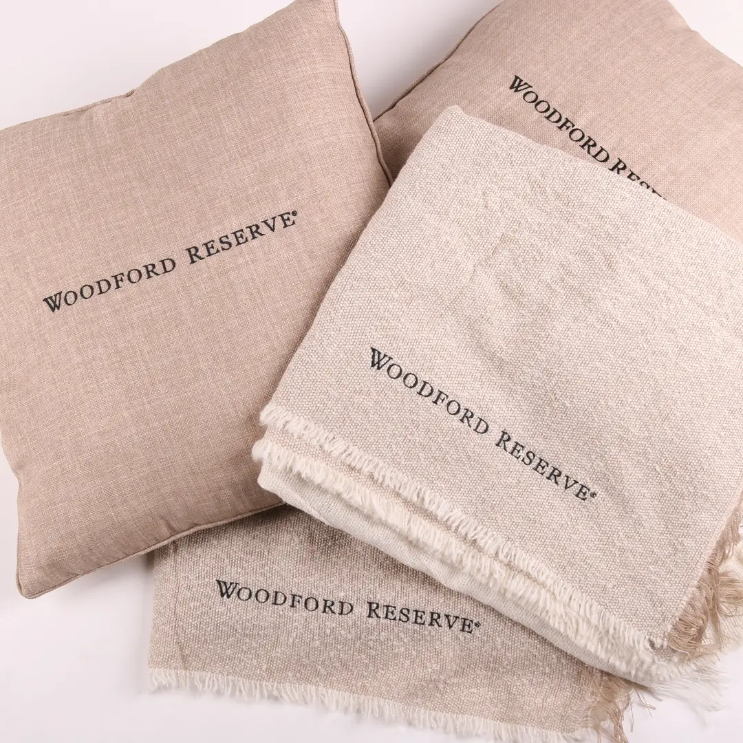 For this project I embroidered white cushion covers and blankets with the Woodford Reserve logo in black cotton thread. It started out as one batch at the end of 2022 and grew to be many, many more over the next 12 months. The design is simple and elegant. Embroidery helps elevate the quality of branded merch, a printed design would not work as effectively or be a durable.