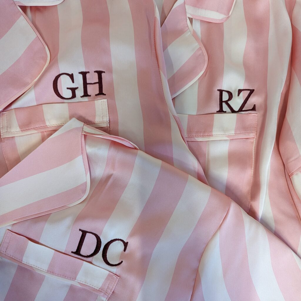 These pyjamas are a perfect way to mark a special occasion. They were a gift from a bride to her bridal party, each one emrboidered with their initials. They are a wonderful way to add a personal touch to the big day with something they can each keep and use over and over again.